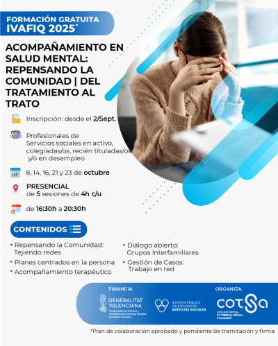 Abrimos inscripciones para el nuevo curso gratuito “ACOMPAÑAMIENTO EN SALUD MENTAL:REPENSANDO LA COMUNIDAD: DEL TRATAMIENTO AL TRATO”. Formación financiada por el Institut Valencià de Formació, Investigació i Qualitat dels Serveis Socials.