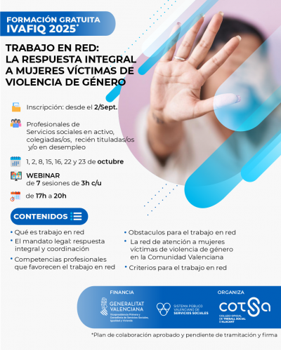 Abrimos inscripciones para el nuevo curso gratuito “LA IMPORTANCIA DEL TRABAJO EN RED: LA RESPUESTA INTREGRAL A LAS MUJERES VÍCTIMAS DE VIOLENCIA DE GÉNERO”. Formación financiada por el Institut Valencià de Formació, Investigació i Qualitat dels Serveis Socials.