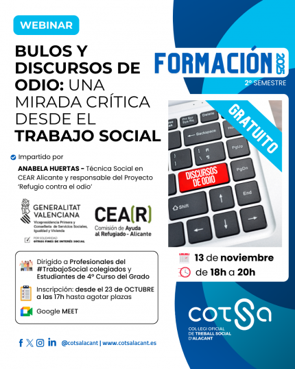 Este encuentro online en colaboración con la Comisión de ayuda al Refugiado de Alicante , tendrá lugar a través de la plataforma Google Meet de COTSA, está dirigido tanto a profesionales en activo como a estudiantes de trabajo social .