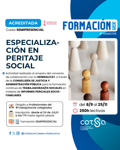 El curso está dirigido a las personas colegiadas de Colegio Oficial de Trabajo Social de Alicante que forman parte del turno de peritaje 2025, a funcionarios/as Trabajadores/as Sociales del IMLCF de Alicante, así como a aquellos profesionales del trabajo social colegiados/as que deseen especializarse en peritaje social para formar parte en un futuro del turno del COTSA.